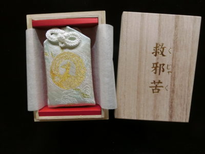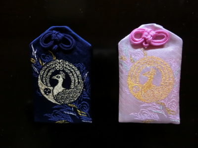 救邪苦御守は孔雀の羽を封入した特別なお守りで、災いを除き疫病を避けるご利益があるとされています。また、毎月9日限定で授与される「白救邪苦御守」(1,500円)もあります。