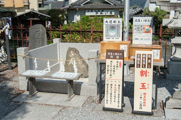 神社では「叶い戌」という特徴的な祈願スポットがあり、願いごとによって撫でる干支の石が変わります。また、厄割り石もあり、厄難や悩み事を念じて石に向かって玉を投げることで厄払いができます。