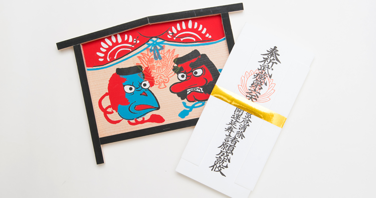 天狗は神社の御眷属(御使役)であり、諸々の心願や信仰の仲立ちをする役目を持ちます。古来より手書きの手法で伝わる向かい天狗の絵馬は、火難・盗難・疫病を除き、邪気を祓い、家内安全、五穀豊穣、商売繁盛などに霊験があるとされています。