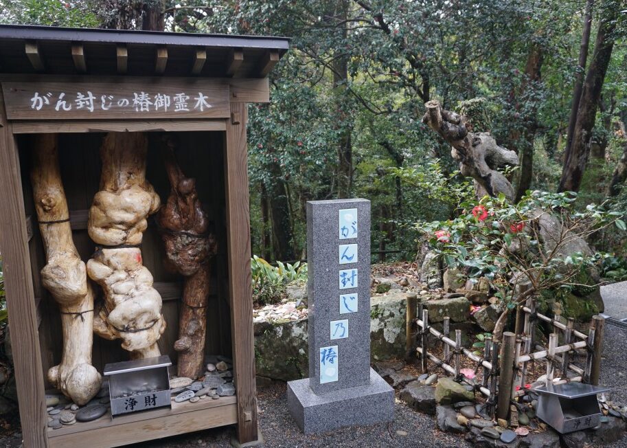 金剛頂寺には「がん封じの御霊木」といわれる大きな椿の木があります。この木を撫でるとがんを封じることができるとされており、「がん封じの御霊木」として祀られています。このような癌にゆかりのある霊木があるのは四国でも金剛頂寺だけです。