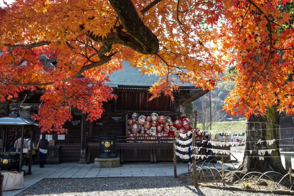 秋の紅葉時期には、赤い達磨と紅葉が見事にマッチした風景を楽しめるのは全国でもここだけです。境内が紅葉に染まる様子は圧巻で、多くの参拝者が訪れます。