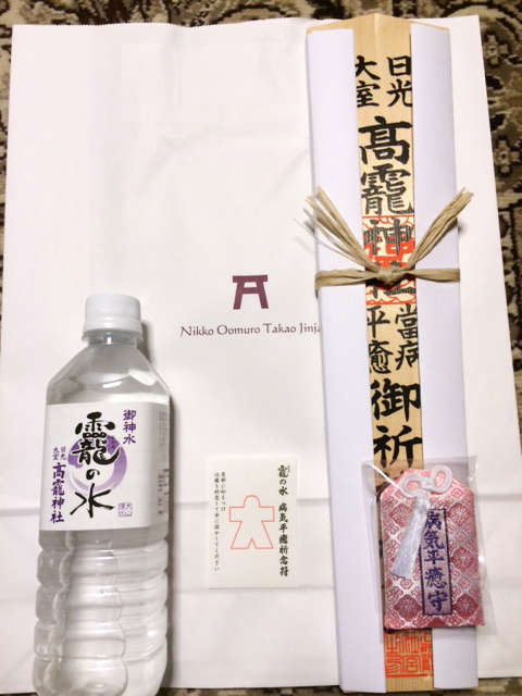 祈願者には、お名前を墨書きした病気平癒祈祷の木札と御守り、御神水を授与されます。